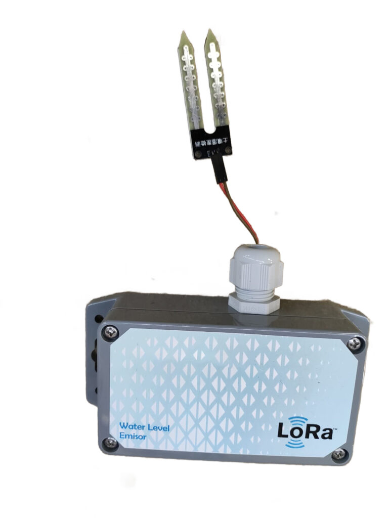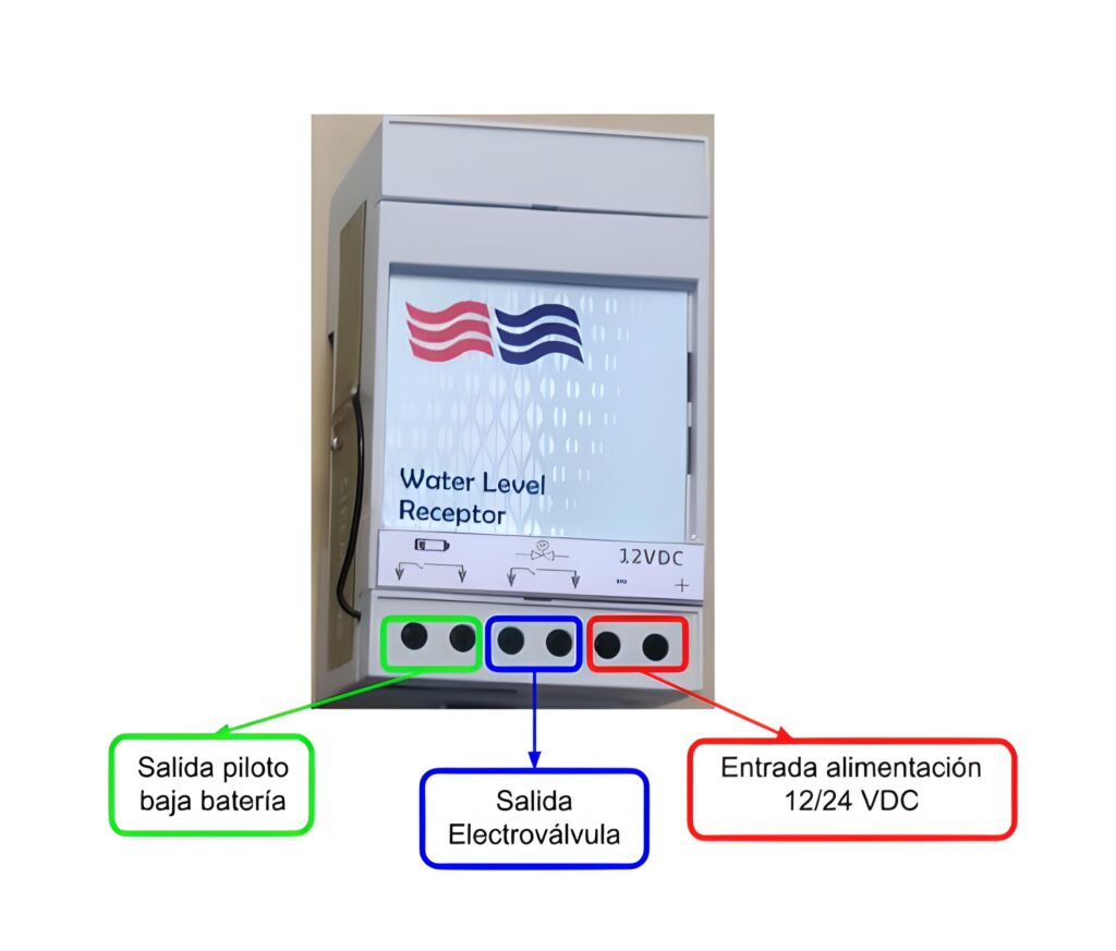 El emisor dispone de un sensor conductivo que da una señal en caso de que ambas varillas entren en contacto con el agua. Está alimentado mediante 2 pilas alcalinas AA. Ha sido diseñado para que la alimentación tenga una 1 año de vida útil a menores.